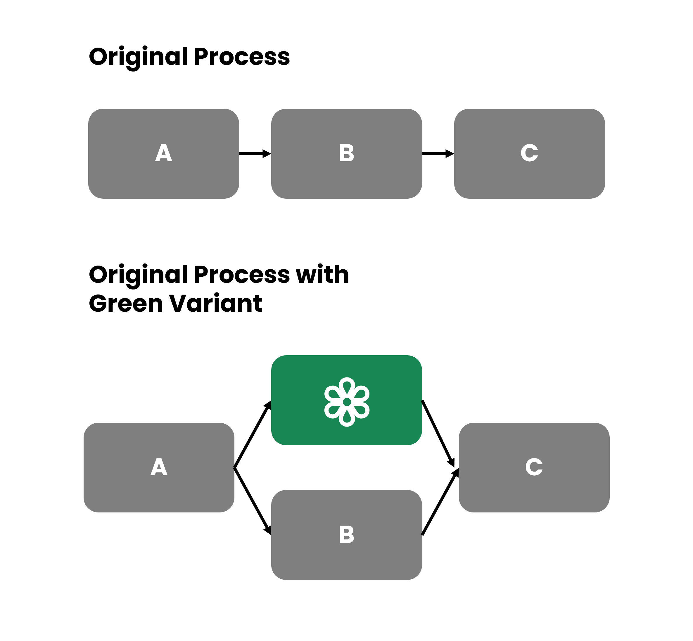 The organization provides an alternative green business process variant that achieves the same result as before. However, it may use different process steps, resources, or partners to perform the process. The previous existing business process remains.